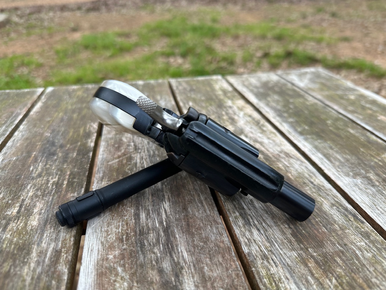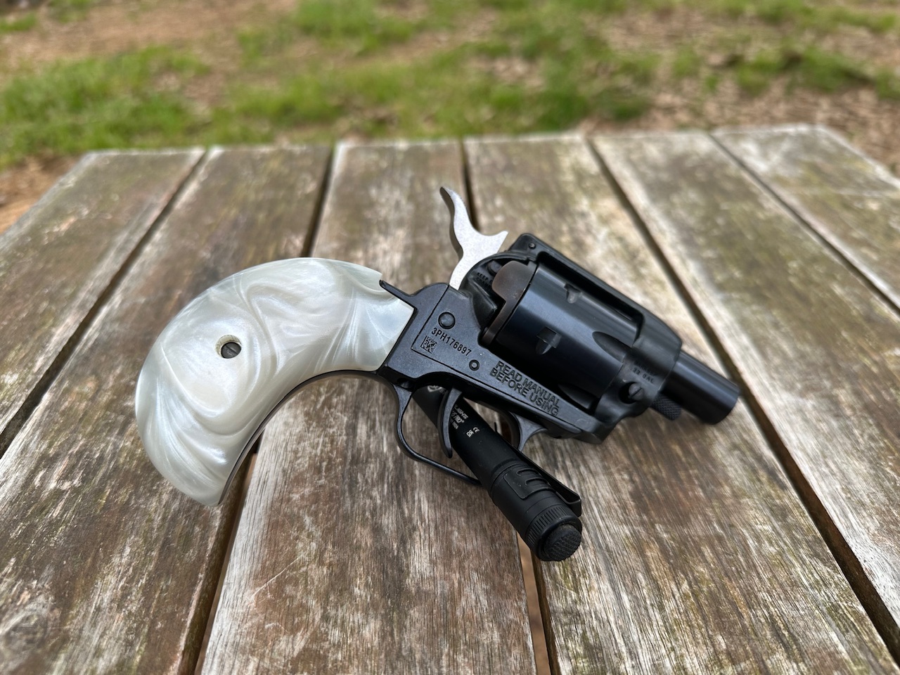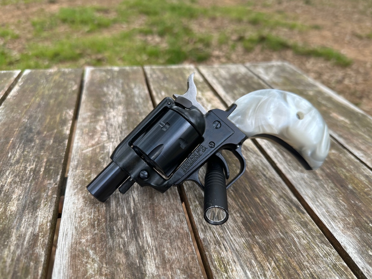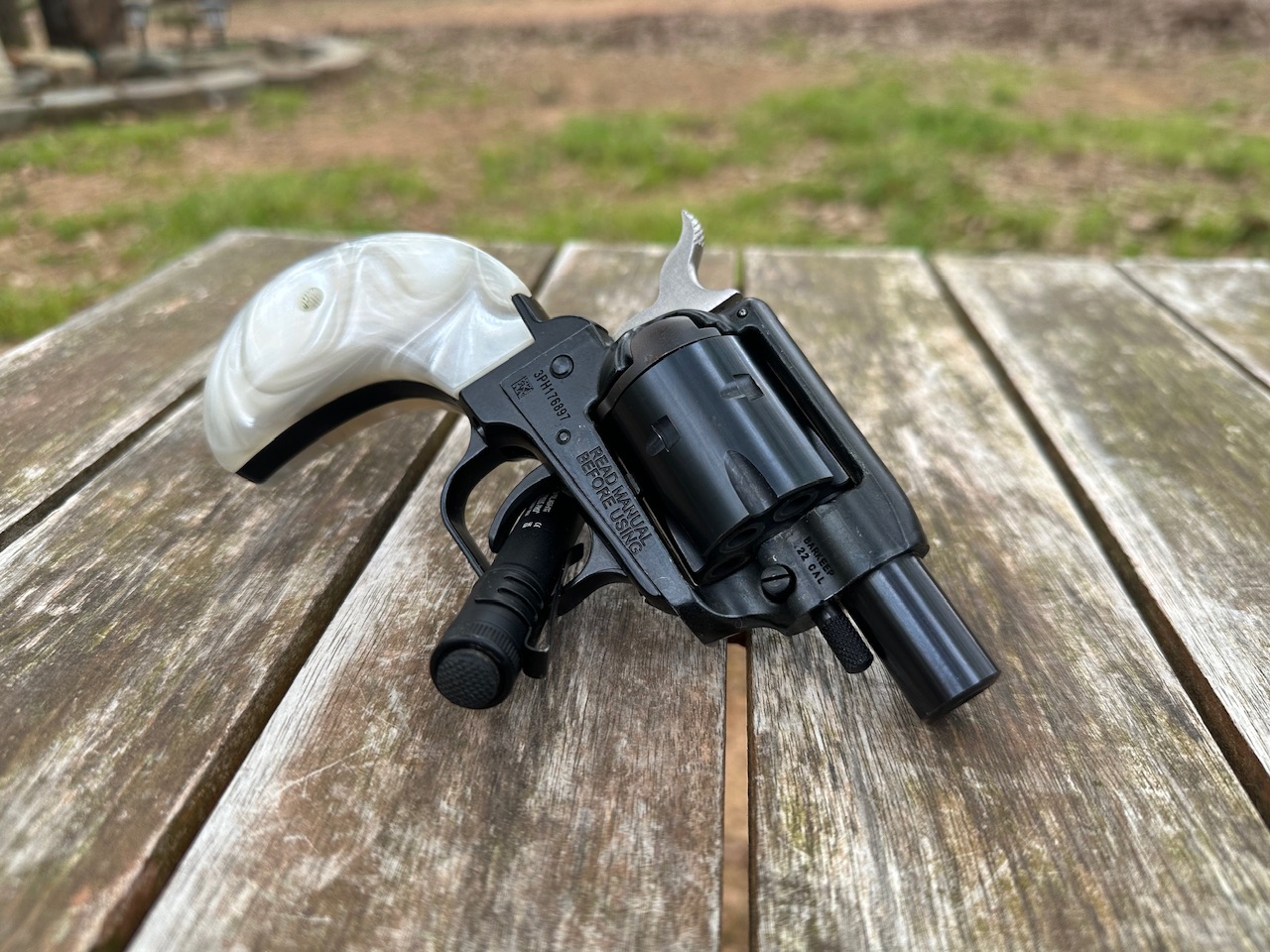 Heritage, Barkeep Boot, Revolver, Single Action Only, 22LR, 1.68″ Barrel, 6Rnd Cylinder, Black Finish, Pearl Grips, Used, Like New, Original Box & Belongings.