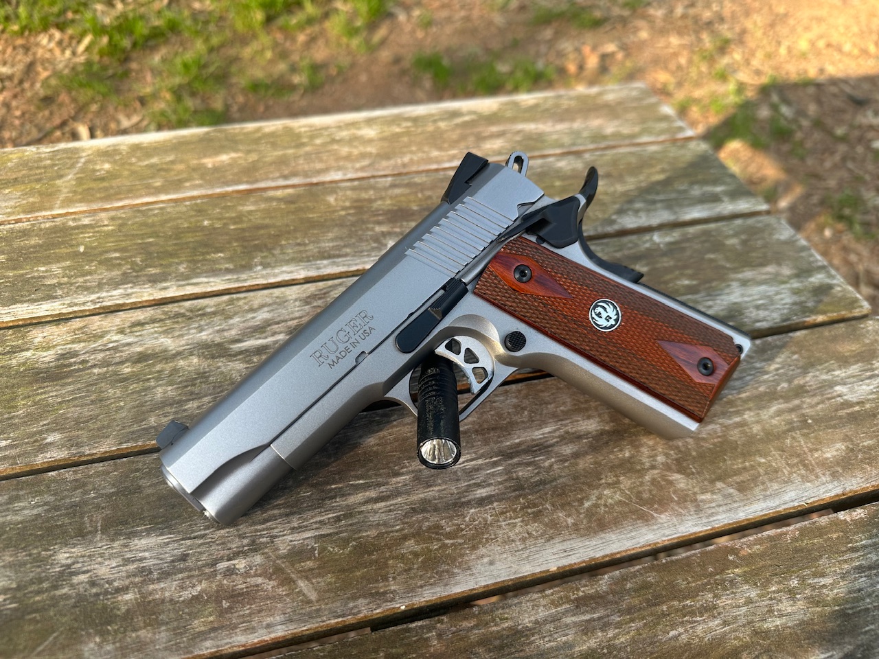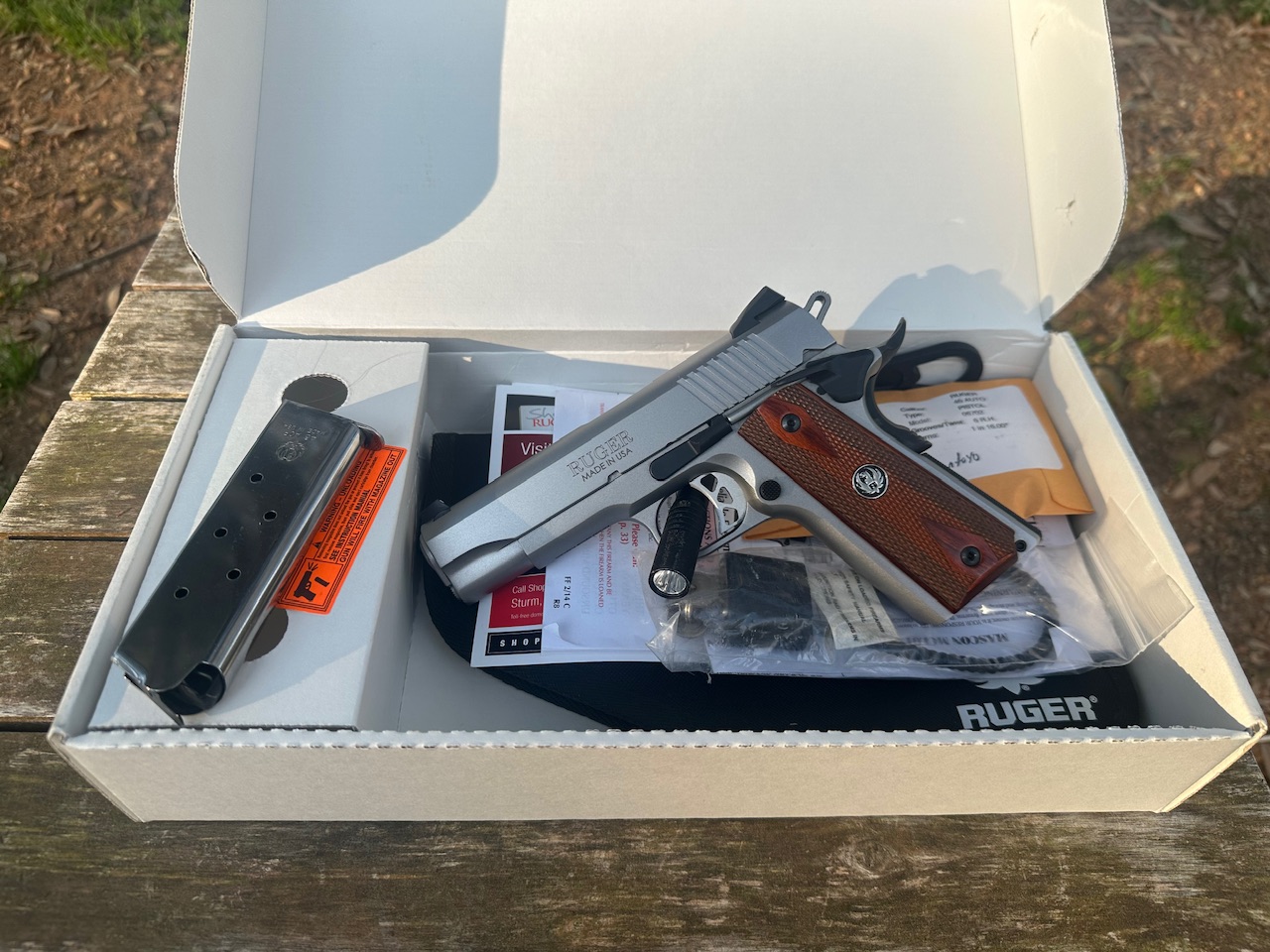 Ruger, SR1911, 1911, Semi-automatic, Metal Frame Pistol, Commander, 45 ACP, 4.25″ Barrel, Stainless Steel, Low-Glare Stainless Finish, Hardwood Grips, Drift Adjustable Novak 3 Dot Sights, 7 Rounds, Used, Excellent Condition, Original Box & Belongings.