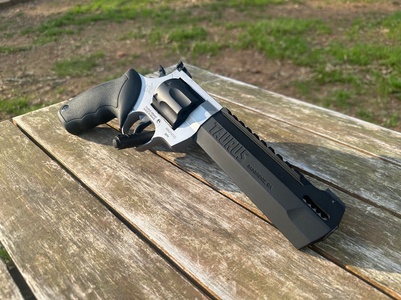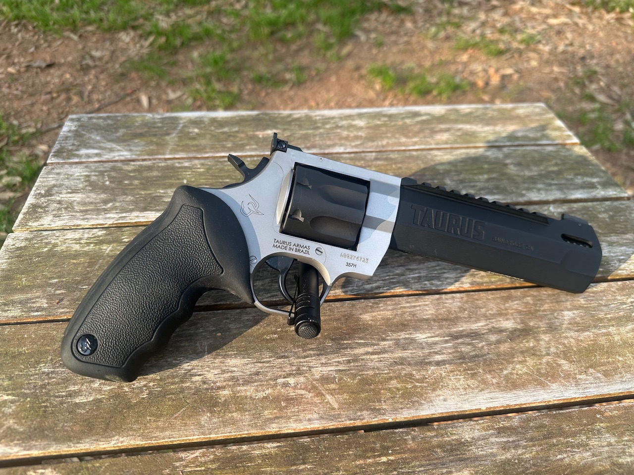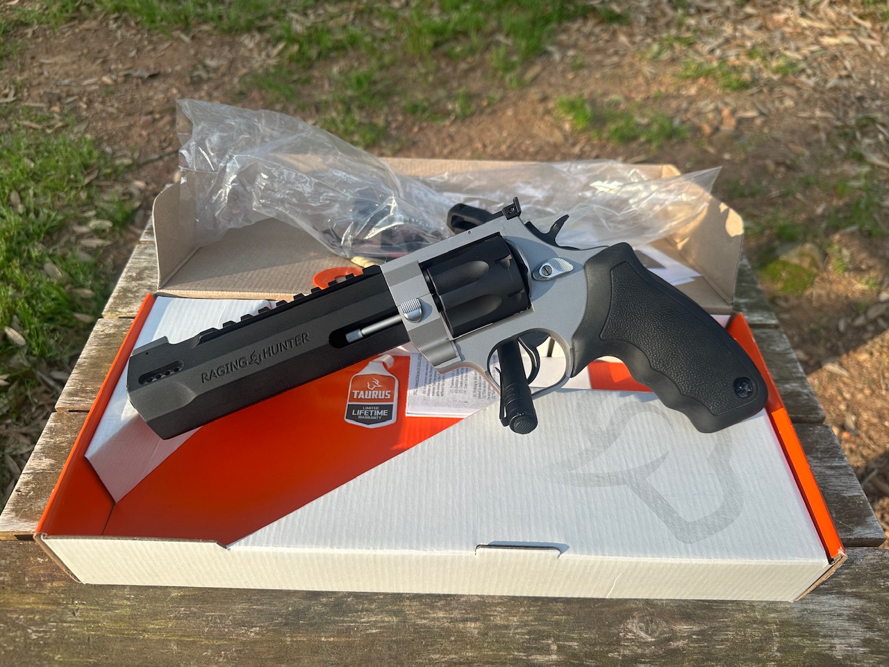 Taurus USA, Raging Hunter, Double Action, Metal Frame Revolver, Large Frame, 357 Magnum/38 Special +P, 6.75″ Exact Barrel Length, Stainless Steel, Matte Finish, Two-Tone, Rubber Grips, Adjustable Sights, 7 Rounds, Used, Excellent Condition, Original Box & Belongings.