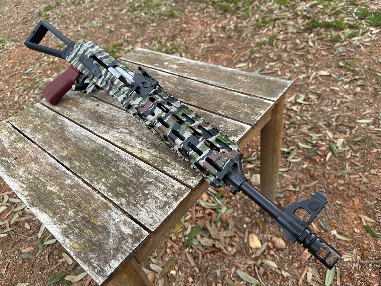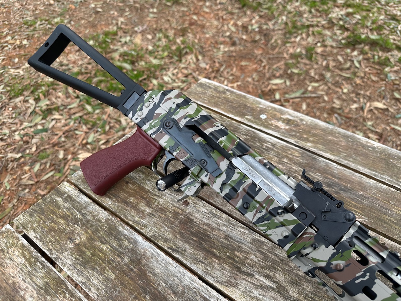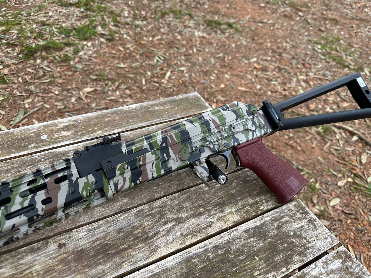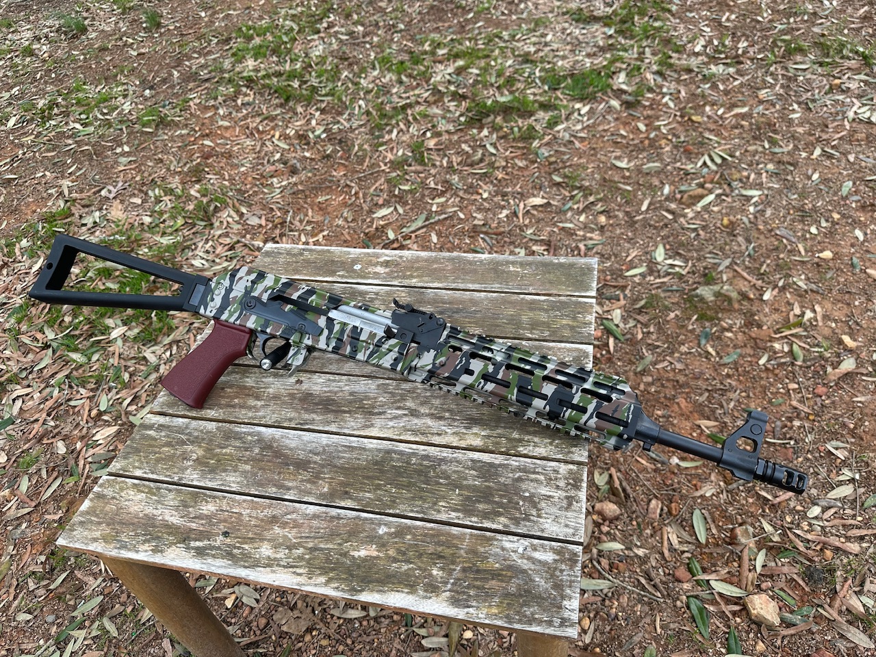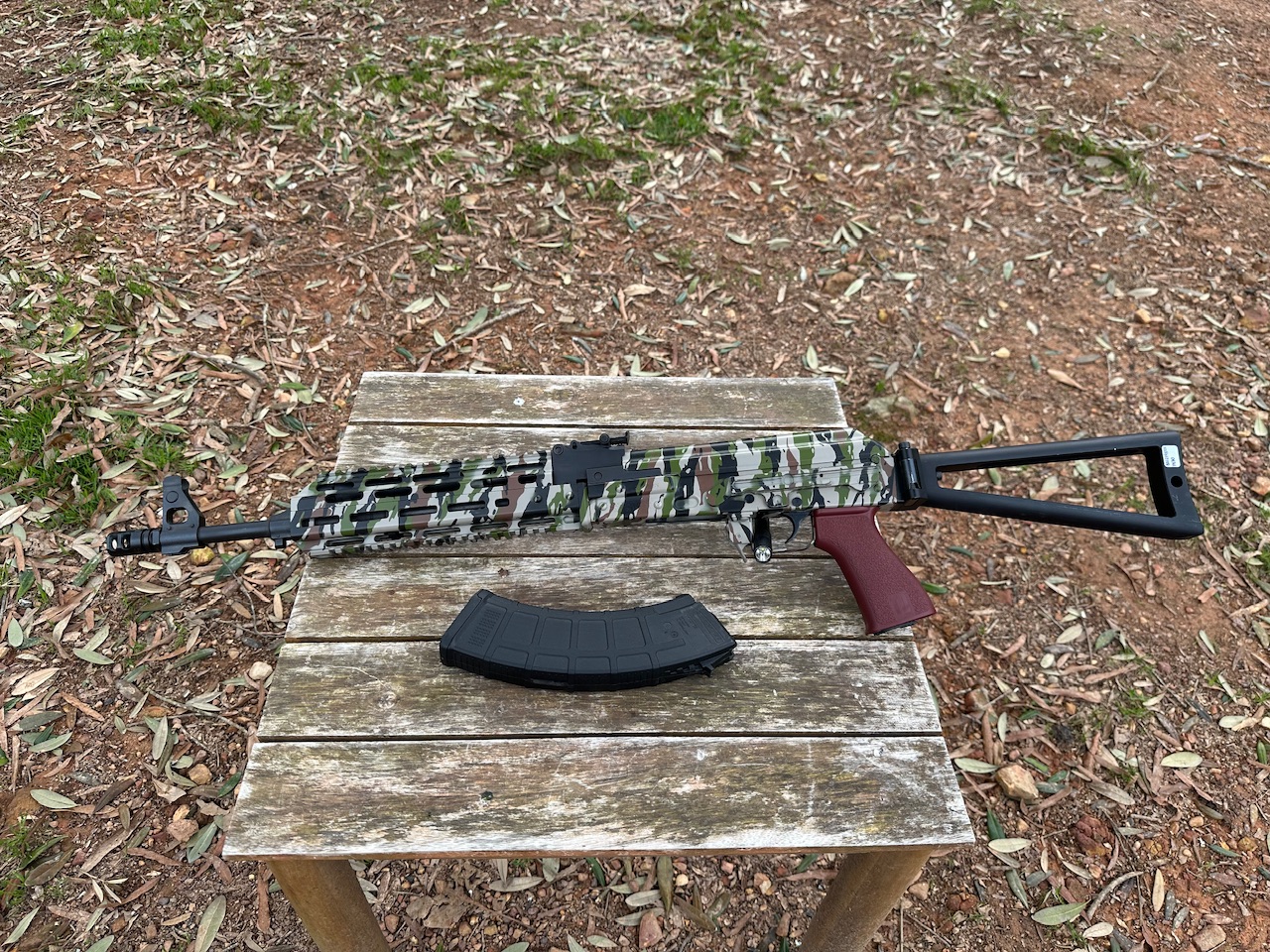Zastava, ZPAP M70, Yugo AK47 Variant, Rifle, Semi Automatic, 7.62x39MM, 16.3” Barrel, Side Folding Triangle Stock, Texas Weapon Systems MLOK Handguard, Cerakoted Camo Finish, 1 30Rnd Magpul PMAG, Used, Excellent Condition.